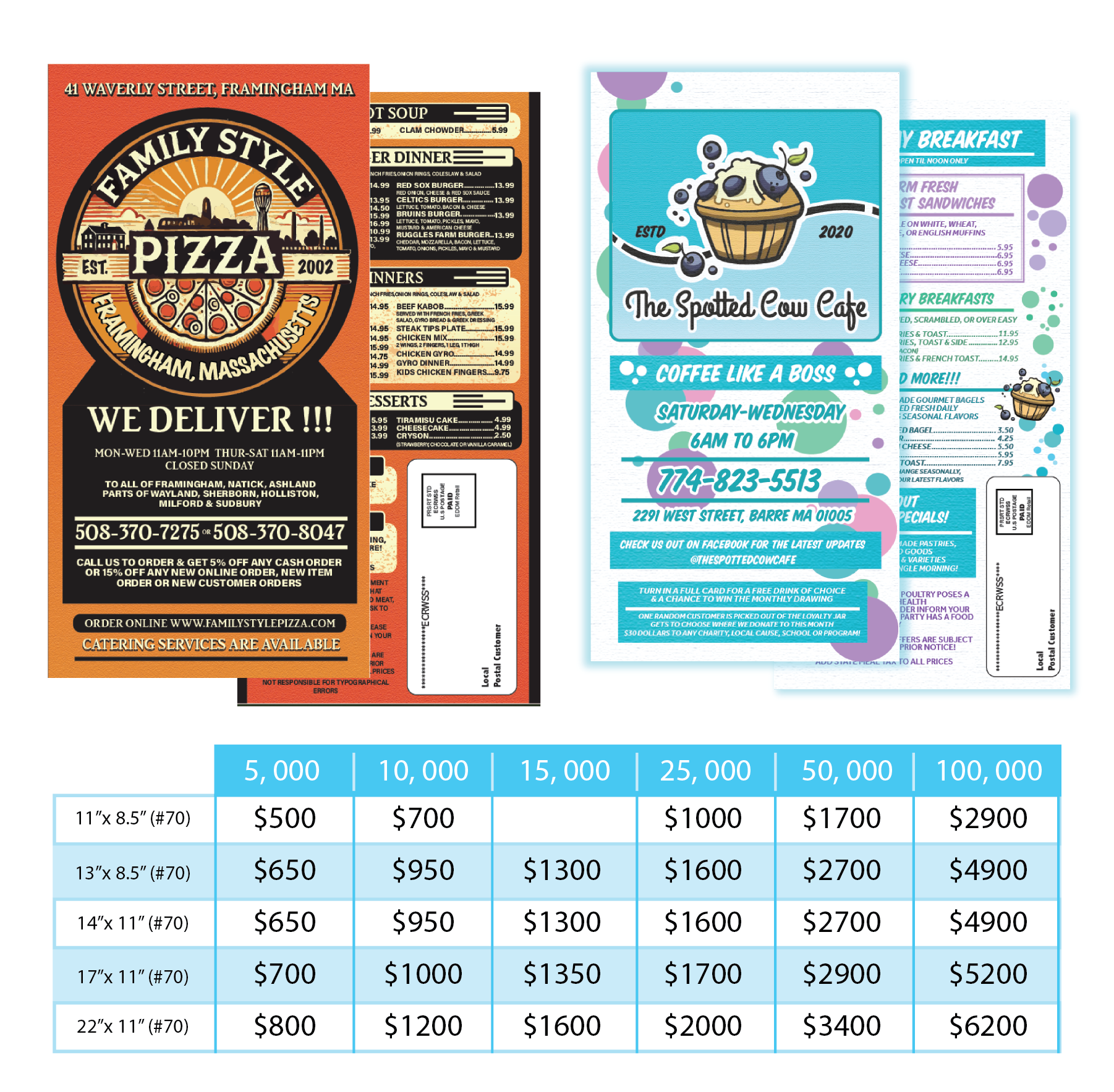 We offer full-color printing on a variety of paper types and sizes, perfect for dine-in menus, take-home menus, promotional flyers, event handouts, and more. With flexible design options and fast turnaround, we make it easy to get your message out—clearly and professionally.
